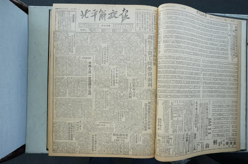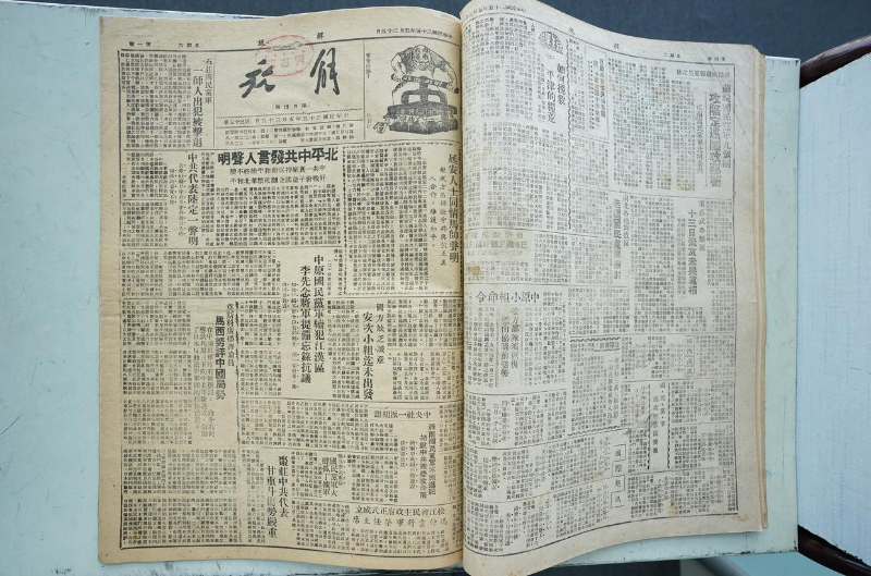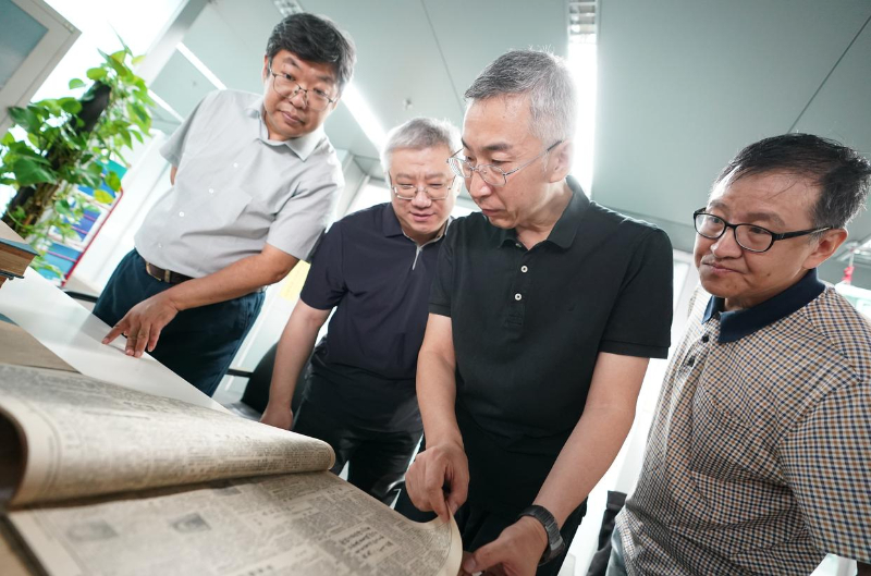 北京日报社副总编辑曹斌(右二)出席活动启动仪式。北京日报客户端记者方非 摄本次专题展示从国家图书馆馆藏中撷取《北京日报》的精彩篇章,采用编年体形式展出,让读者朋友们跟随展示走进历史,见证守护,共期未来。活动以“背景板+实体报纸”形式开展,其中背景板从《北京日报》历史版面中选取18篇重要报道进行图文展示,以北京发生的国家大事及北京人民生活的变迁为主要内容。同时,主办方从背景板内容中选取7件国家大事报道的实体报纸,在展柜中进行馆藏展示。