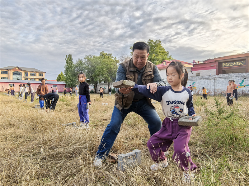 为解决缺少训练器材的难题,白鹤江想出了各种土办法:改造农具当训练器材,轮胎、石锁就成了教具。“你看,这是砘子,有20斤、25斤、35斤等不同重量,原本是农田里压土用的老物件,现在给孩子们练力量用。”