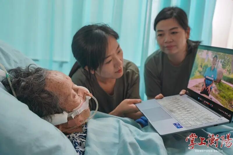 6月26日下午,工作人员在病床前为黄厚瑜老人播放新疆籍受助学生的问候。彭斌 摄