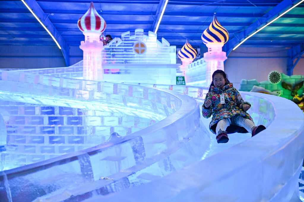 炎炎夏日,江苏淮安金湖水上森林景区内的春溪林海雪原迎来众多游客。据介绍,该室内冰雪世界由哈尔滨冰雕团队打造,面积超3000平方米,置身其中,仿佛走进冰雪童话世界,尽享夏日清凉。新华社记者季春鹏摄