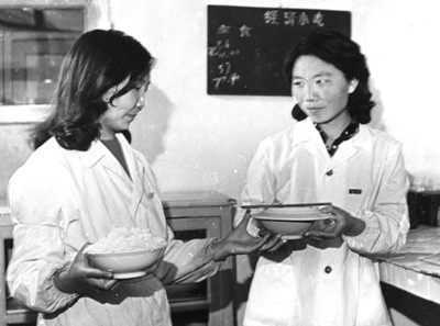 2—3.食堂服务员为患病的牧民旅客准备了可口的饭菜,送到房间里就餐。(1983年摄)