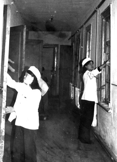 2—5.客房服务员擦拭走廊门窗,做到窗明几净、木见本纹。(1983年摄)