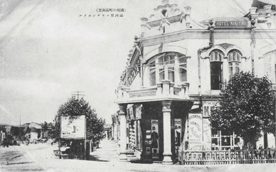 12.位于三道街街口东北角。俄国人开办的“尼基金旅馆”,一层街角门市为“克罗姆皮克商店”。图中可见三道街街口往北的街景。(上世纪30年代摄)