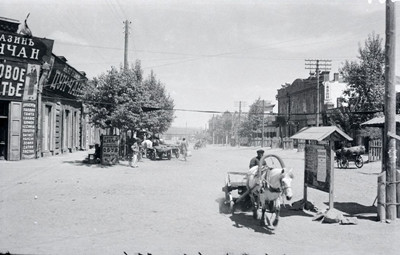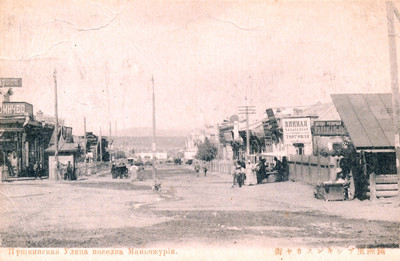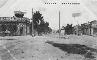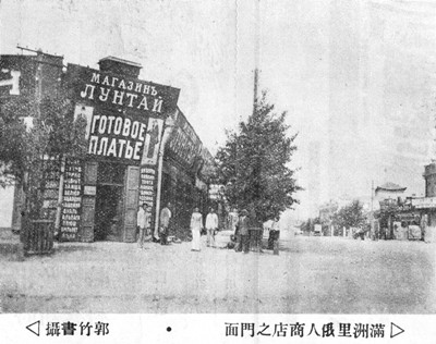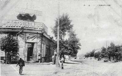 1.从一道街街口向北拍摄。原图说明为“满洲里镇普希金大街”西侧街角为“杜林阿托斯食品商行”,东侧街角为“果酒类食品杂货商行”。(上世纪初叶摄)