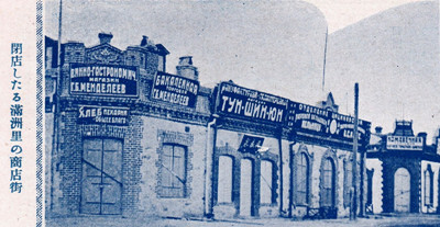13.位于四道街至五道街西侧。俄文牌匾为“门捷列耶夫烟酒食品店”,下方牌匾为“面包店”,往北为“门捷列耶夫食品杂货商行”,下方中文牌匾为“瑞盛东商行”。(1929年摄)