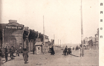 6.从二道街街口向北拍摄。西侧街角建筑门市为“满洲里贸易商社”。(1918年摄)