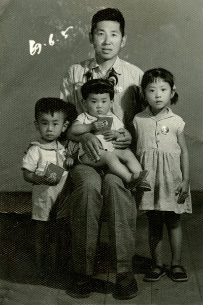 1969年,祖父高学发与儿女们合影。前排右为六姑高玉杰,左为爸爸高鸿章,怀抱为七姑高玉玮。