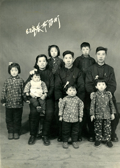 1962年春节,祖父高学发、祖母李秀英与其哥哥高学良携儿女们合影。后排右起高云章(高学良长子)、大姑高玉华,左侧为二姑高玉玲,前排右起为:三姑高玉芬、四姑高玉珠、五姑高玉欣。