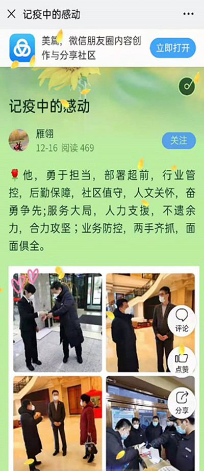 街道、社区全体干部职工放弃休息时间,一直坚守在工作岗位上,每天要连续工作十几个小时,为了节省防控物资,大家可以七八个小时不吃不喝不上厕所。尽管腰已酸、腿已直,但没有人喊累,实在站不住了就地依靠着墙、柱子站一会儿又迅速投入到工作当中。在外执勤的同志们要面对零下三十几度的严寒,一站就是几个小时,脚冻木了,手冻僵了,但仍然井然有序地组织居民进行检测。为了抗击疫情,有的夫妻都投入到疫情防控工作中,把小孩儿托付给老人照看。