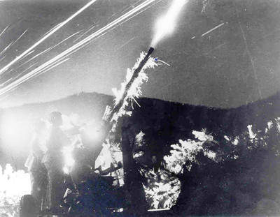 志愿军伪装后的高射炮在夜间开火。