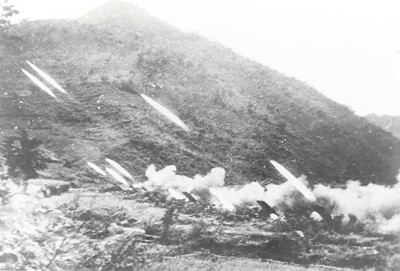 金城战役中,志愿军火箭炮对敌方阵地进行射击。