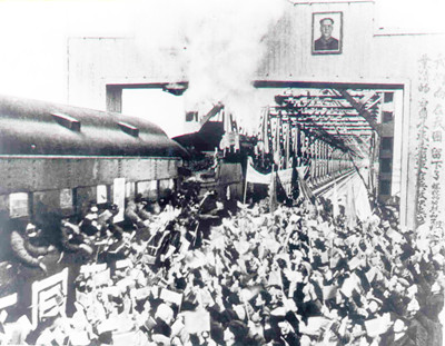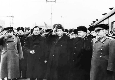 1949年12月16日,毛泽东主席访问苏联,在抵达莫斯科车站时受到苏联党政领导人的热烈欢迎。