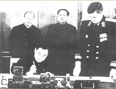 图为1950年2月14日《中苏友好同盟互助条约》及其它协议的签字仪式。