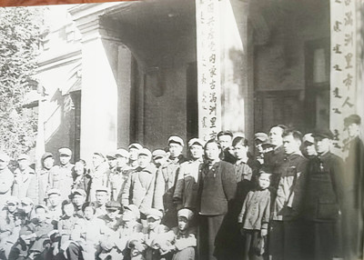1951年,志愿军归国代表团成员与满洲里市领导等在满洲里市政府办公楼门前合影。