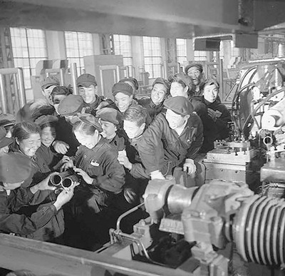 鞍山钢铁公司无缝钢管厂的工人们争相观看我国生产的第一根无缝钢管。鞍山钢铁公司是156项重点工程项目之一。