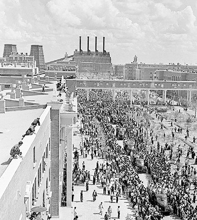 试制的解放牌汽车出厂报喜时,长春第一汽车厂的职工夹道欢庆。长春第一汽车厂是156项重点工程项目之一。