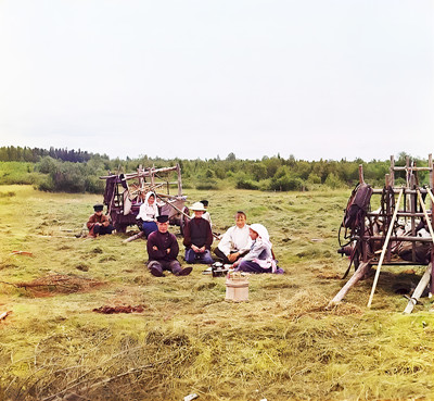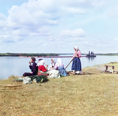 1909年俄罗斯,人们干完农活后在河边吃午餐。
