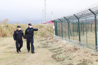 无死角、无漏洞,全天候,这是对口岸疫情防控工作的要求,也是民警巡逻管控的要求。接近十月,晚上七点,满洲里天色已然大黑,两束手电灯光伴随着红蓝警灯沿着铁路两侧的围网游弋,这是满洲里站货场派出所执勤民警韩林河和同事正在对围封和监控设施进行巡查。