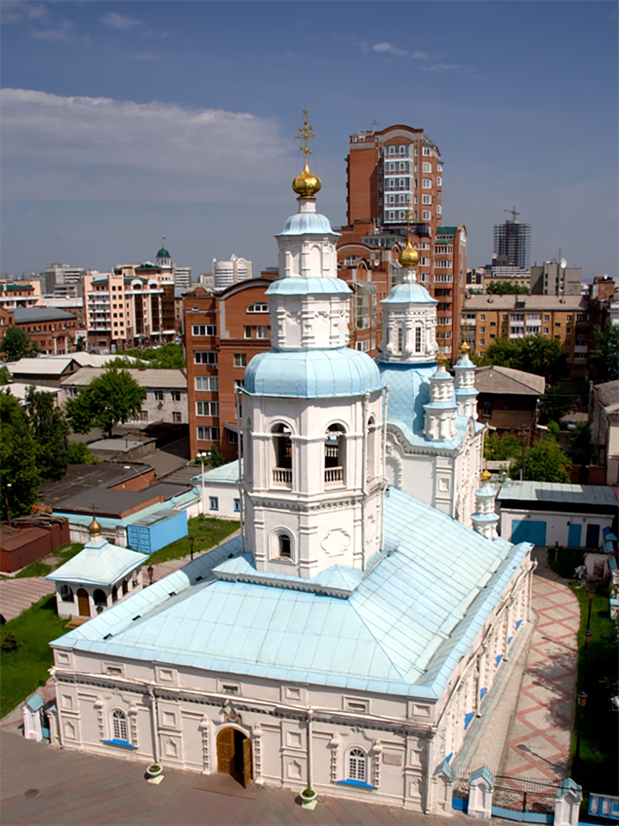 这几天在克拉斯诺亚尔斯克没有拿出太多的时间去观看城市市容和老建筑,只是在出行的途中顺路走马观花地看了一下。中西伯利亚工商会的工作人员见我们对城市建设很感兴趣,就主动向我们做了一番介绍。他说,在克拉斯诺亚尔斯克这座城市里保存最好的历史老建筑就是教堂,无论是沙皇俄国统治时期、苏联统治时期,还是现在的俄罗斯统治时期,教堂在人们心目中的位置始终是无法取代的。克拉斯诺亚尔斯克的俄国东正教教堂主要有求悯大教堂、宣誓大教堂、圣三位一体大教堂、约翰浸礼会、新迈克尔大天使教堂,其中求悯大教堂是克拉斯诺亚尔斯克最古老的教堂。