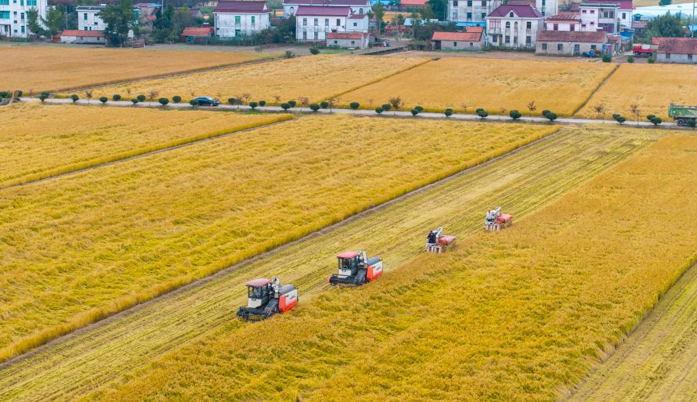 2025年10月30日,在江苏省南通市通州区十总镇育民村高标准农田里,村民驾驶农机收割水稻(无人机照片)。新华社发(翟慧勇摄)