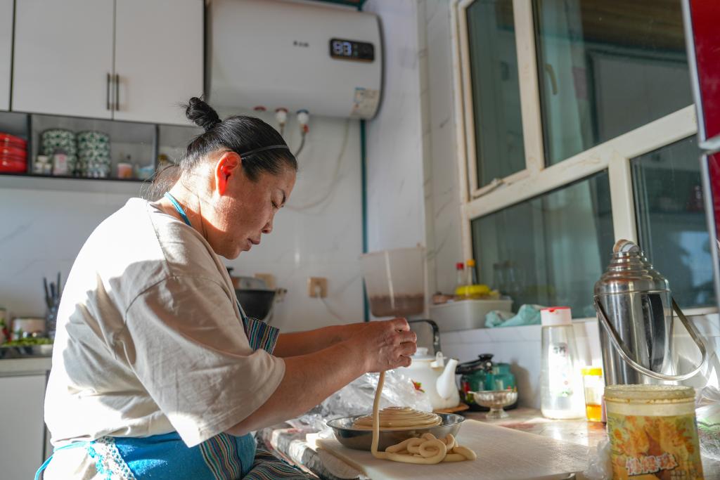 室外哈气成霜,屋内暖意融融。有的村民穿着短袖揉面做“拉条子”,有的老人抱着小孙子斜倚着暖气片在窗边看雪景,还有闲不住的年轻人在屋后打扫棚圈、遛马。