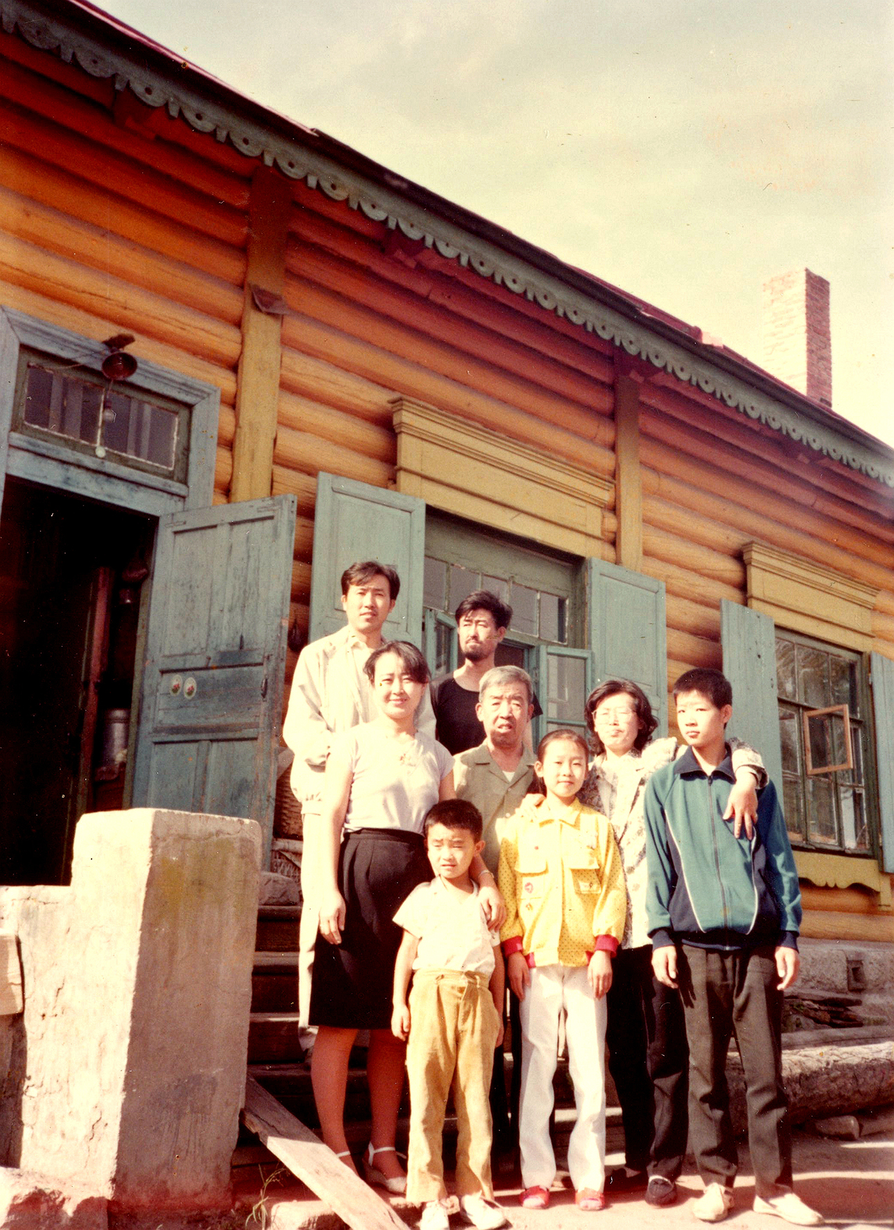 1990年,父亲李栢筠(中间左二)与大姐李玉珍(中间左三)、妹妹李玉艳(中间左一)、弟弟李玉泉(后排左二)、笔者李玉飞(后排左一)以及家族的孙辈们在满洲里电报街20号老宅前合影。