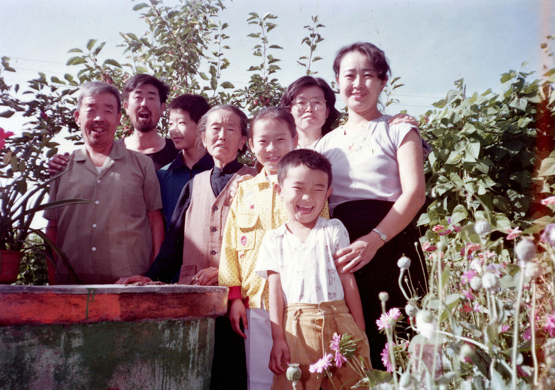 1990年,父亲李栢筠(左一)、母亲张崇芝(左四)与大姐李玉珍(右二)、妹妹李玉艳(右一)、弟弟李玉泉(左二)以及家族的孙辈们在满洲里电报街20号老宅水池旁合影。