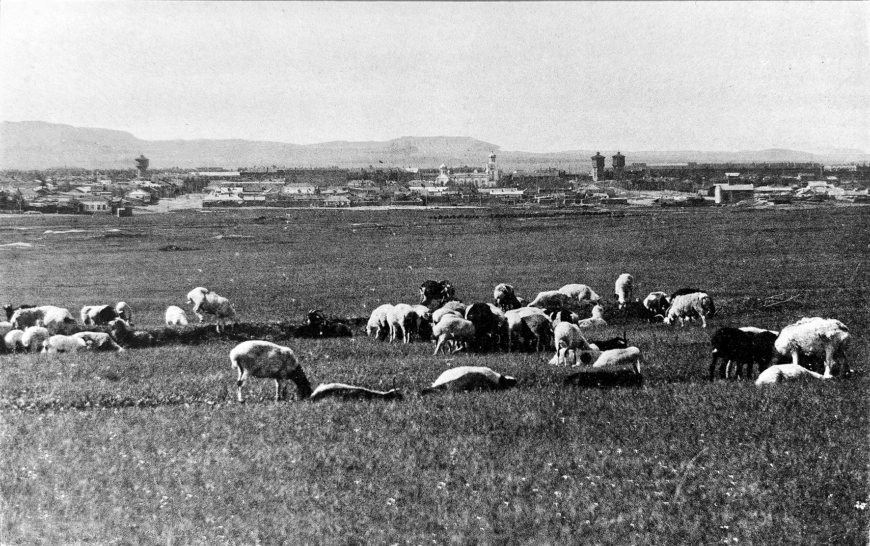 20世纪30年代的明信片。明信片上的图像为满洲里远景,左侧可见道南水塔,右侧可见道北双子水塔。