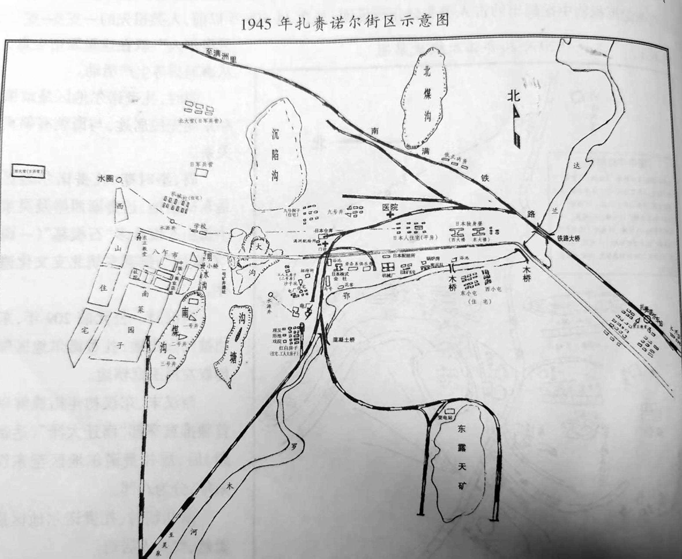 《1945年扎赉诺尔街区示意图》上标注的时间是1945年,众所周知,1945年8月前扎赉诺尔还处于日本侵略者的统治之下,所以我们可以断定,这张图不是日本侵略者投降之后绘制的。基于这样的推断,这张示意图应该是日伪政权下属的有关部门所绘制的。